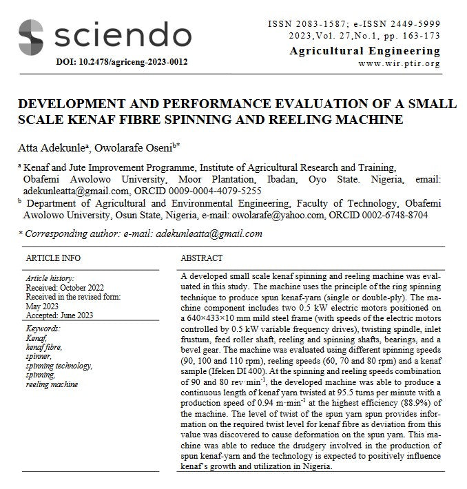 Fiber (2023) Development and Performance Evaluation of Small Scale Kenaf Fibre Spinning and Reeling Machine