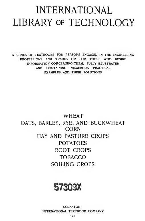 A Series of Textbooks for Persons Engaged in the Engineering Professions and Trades or for Those Who Desire Information Concerning Them. Fully Illustrated and Containing Numerous Practical Examples and Their Solutions: Wheat; Oats, Barley, Rye, and Buckwheat; Corn; Hay and Pasture Crops; Potatoes; Root Crops; Tobacco; Soiling Crops
