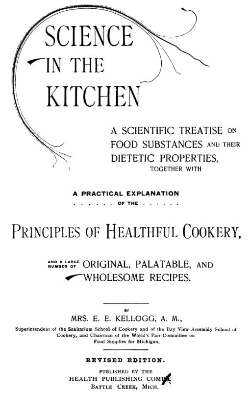 Full title: Science in the Kitchen A Scientific Treatise on Food Substances and their Dietetic Properties Together with A Practical Explanation of the Principles of Healthful Cookery, and a Large Number of Original, Palatable, and Wholesome Recipes by Mrs. E.E. Kellogg, A.M., Superintendent of the Sanitarium School of Cookery and of the Bay View Assembly School of Cookery, and Chairman of the World's Fair Committee on Food Supplies for Michigan; 1892 revised edition