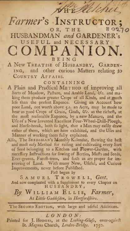 Full Title: The Farmer's Instructor or, the Husbandman and Gardener's Useful and Necessary Companion by Samuel Trowell, Gent. and William Ellis, Farmer; 1750