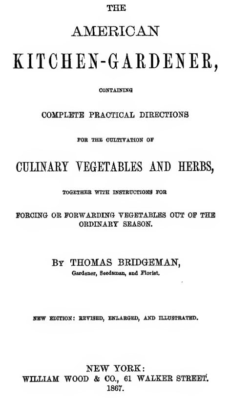 Full Title: The American Kitchen-Gardener, Containing Complete Practical Directions for the Cultivation of Culinary Vegetables and Herbs, Together with Instructions for Forcing or Forwarding Vegetables Out of the Ordinary Season; By Thomas Bridgeman, Gardener, Seedsman, and Florist; 1867