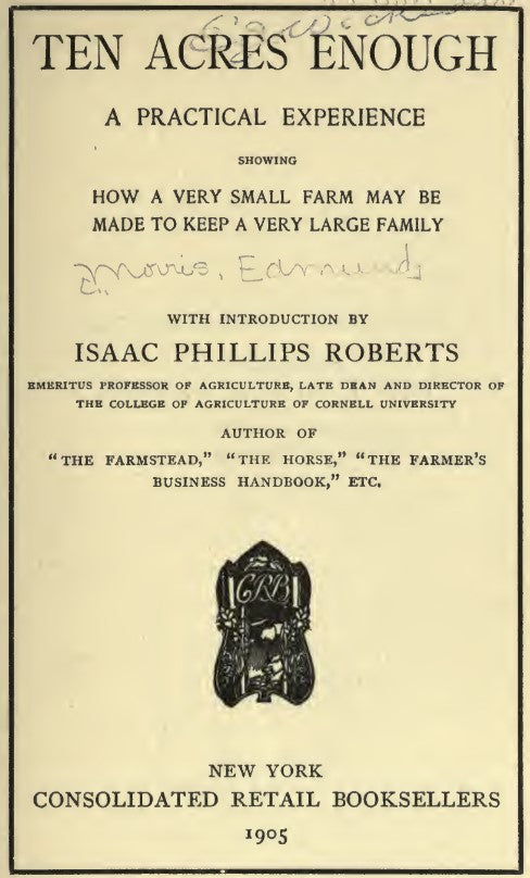 Full title: Ten Acres Enough a Practical Experience Showing How a Very Small Farm May Be Made to Keep a Very Large Family by Edmund Morris with introduction by Isaac Phillips Roberts; 1905